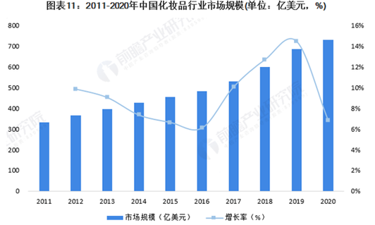 我國的化妝品市場規(guī)模巨大——據(jù)Euromonitor統(tǒng)計(jì)數(shù)據(jù),2011-2022年我國化妝品的市場規(guī)模呈現(xiàn)逐年遞增的趨勢。從2011年331.8億美元增長到了2022年的732.0億美元,復(fù)合增長率約為9.22%。即使在前幾年受疫情影響,化妝品市場規(guī)模仍能保持6.83%的正向增長率,充分體現(xiàn)了我國化妝品市場未來發(fā)展的無限潛力。