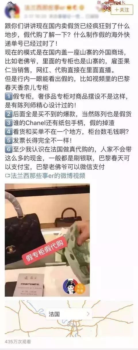 代購深不可測,物流造假并不難,甚至有些假代購為了讓消費(fèi)者相信,牟取暴利,直接在國內(nèi)蓋了一座山寨的外國商場。如香奈兒、巴黎春天、巴黎老佛爺...... 然后雇傭外國人當(dāng)銷售,網(wǎng)紅和代購的直播就在里面進(jìn)行,但里面賣的東西可想而知。